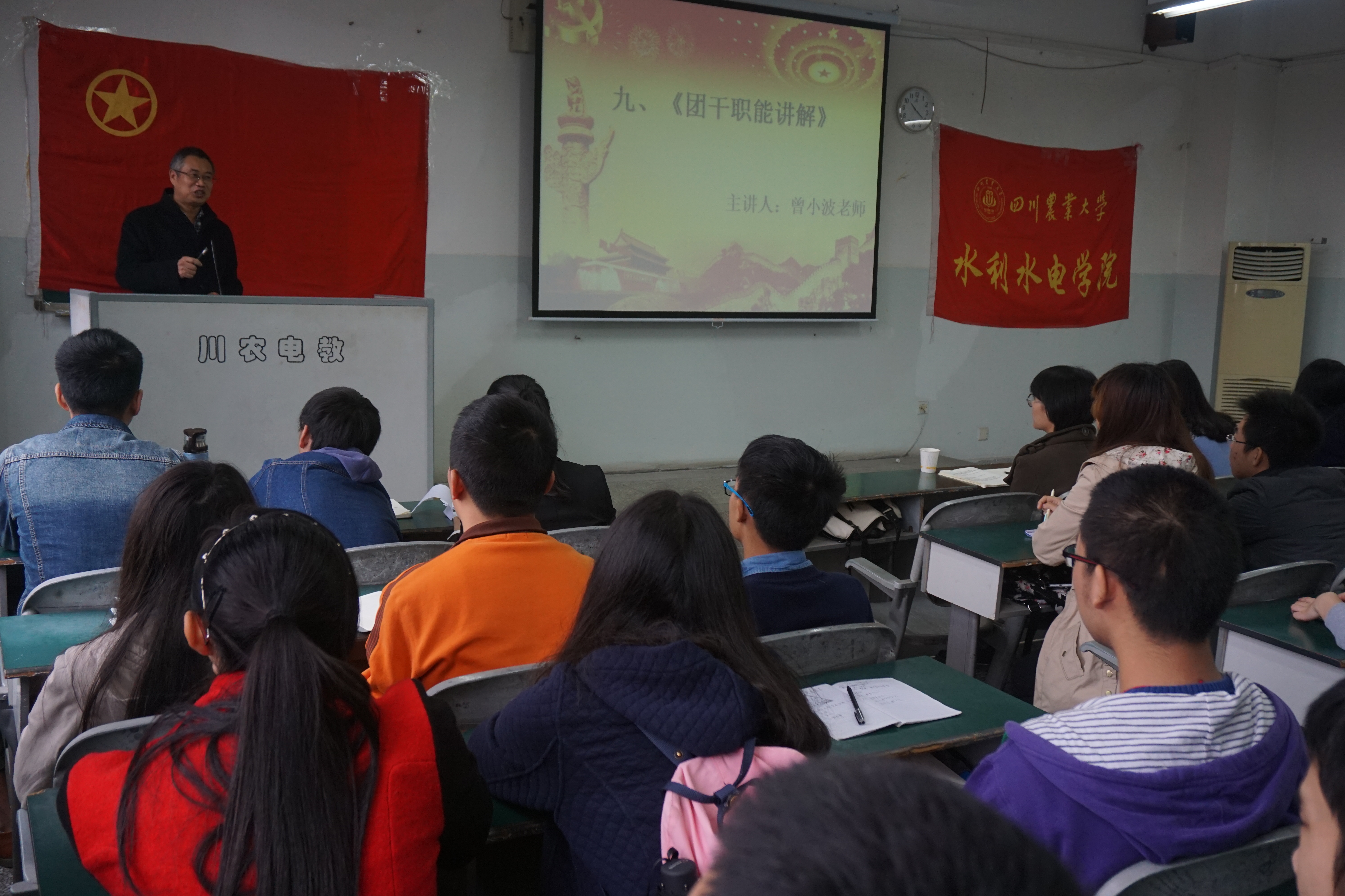 11月14日,新葡的京集团8814登录入口第二届业余团校培训在逸夫楼508举行。学院党委书记曾小波、团委书记张翅、主席团成员、团委各部门成员、团支部干部及新入团团员共计190余人参加此次培训会。