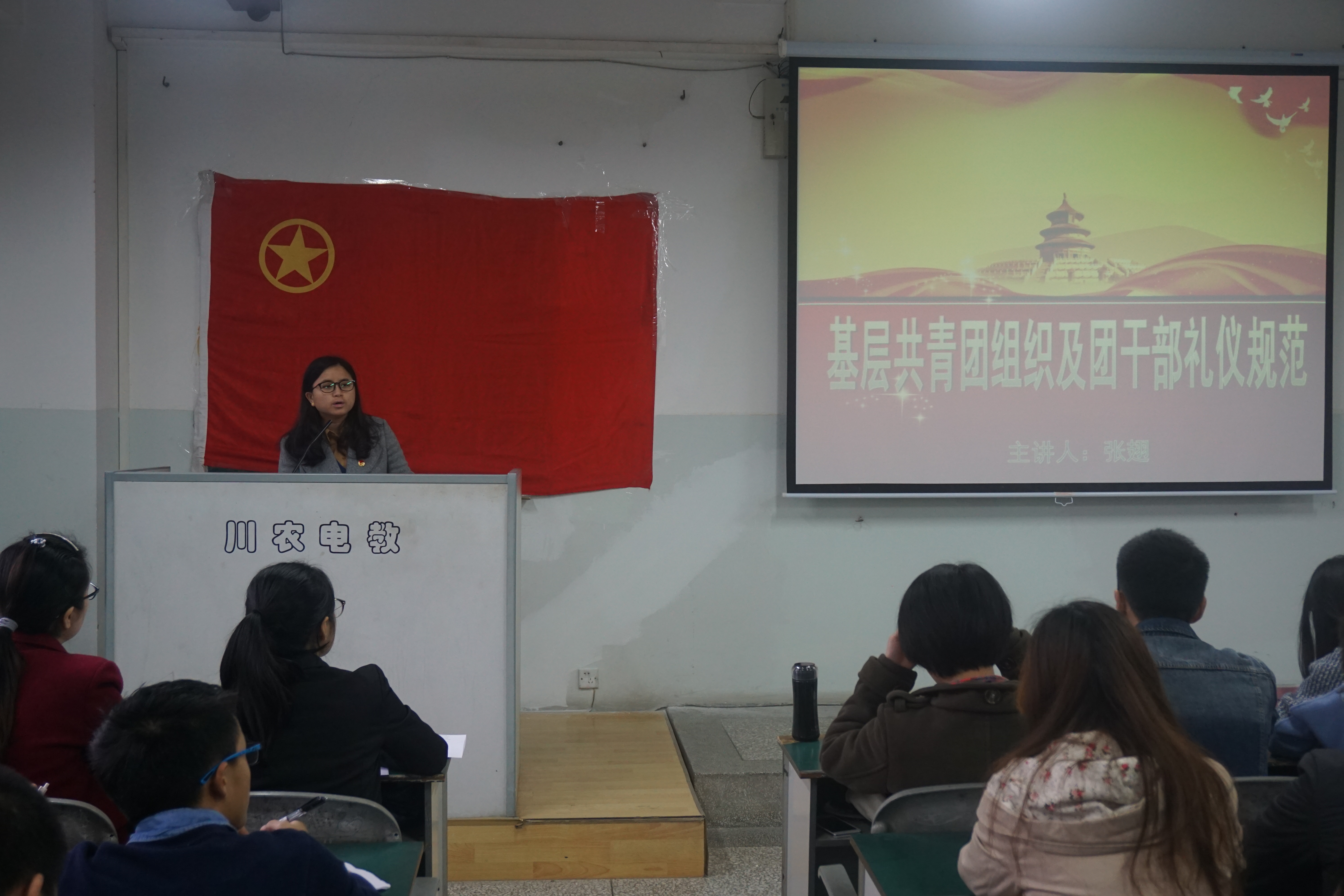 上午8:30,培训在团歌中拉开帷幕。首先,团委组织部同学带来了诗歌朗诵《歌颂共青团—信念追随》,活跃了现场氛围。随后,张翅从基层共青团组织作用、团员管理、团的组织生活及团干部的职责等方面进行了详细介绍,并强调,各团支部要有计划、有针对性地发展优秀青年加入团组织,各位团干部要积极向党组织靠拢,坚持认真严肃地做事态度。此外,她还讲解了团干部的礼仪规范,希望大家在今后的学习工作中遵守礼仪规范,树立团干部的良好形象。