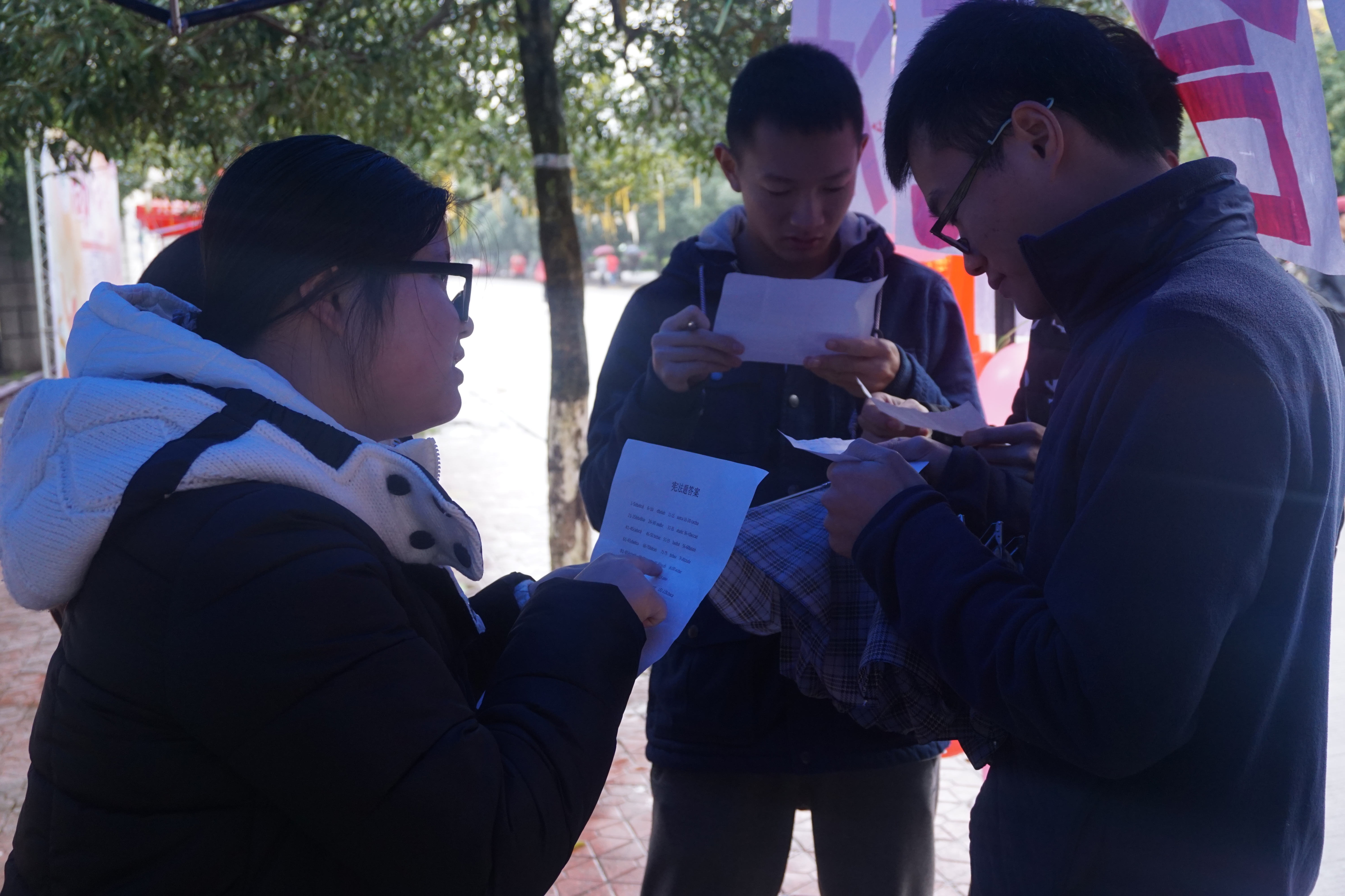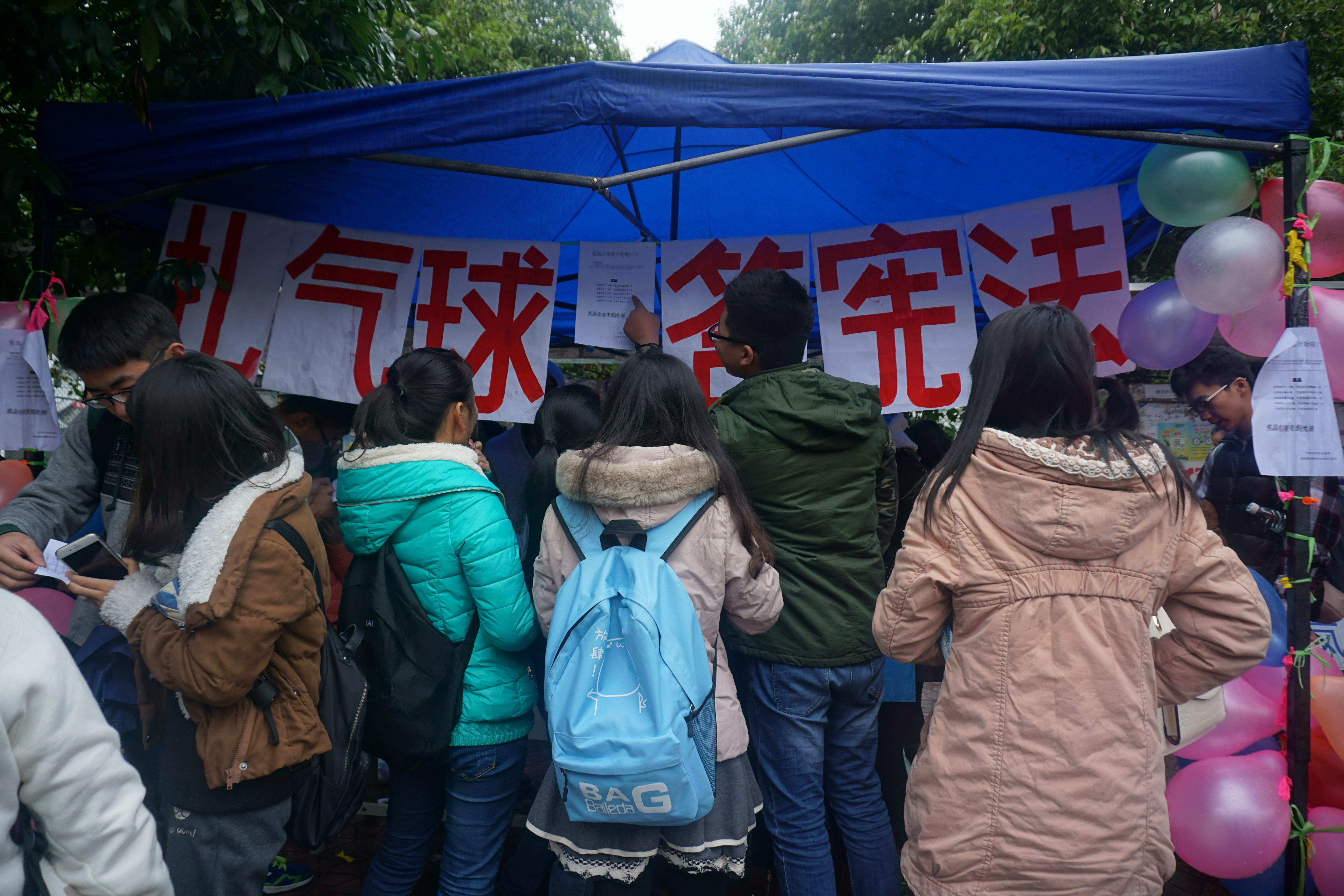 12月4日上午,“扎气球,答宪法”的活动在二区门口火热进行,虽然寒冷的天气还夹杂着纷纷扬扬的细雨,但过往同学纷纷被新颖的活动形式所吸引,现场的火爆氛围仍然丝毫不减。水利2013级2班的王晓艺以连续答对15道宪法知识问题的优异表现获得了当天的电影票大奖,她说:“我觉得这次活动举办得非常成功,观电影,扎气球等活动很新颖,通过答题增加了我对宪法知识的重视,也让我更加坚定了要树立法律意识的信念。”(朱乐红 余静 何云英 张智)