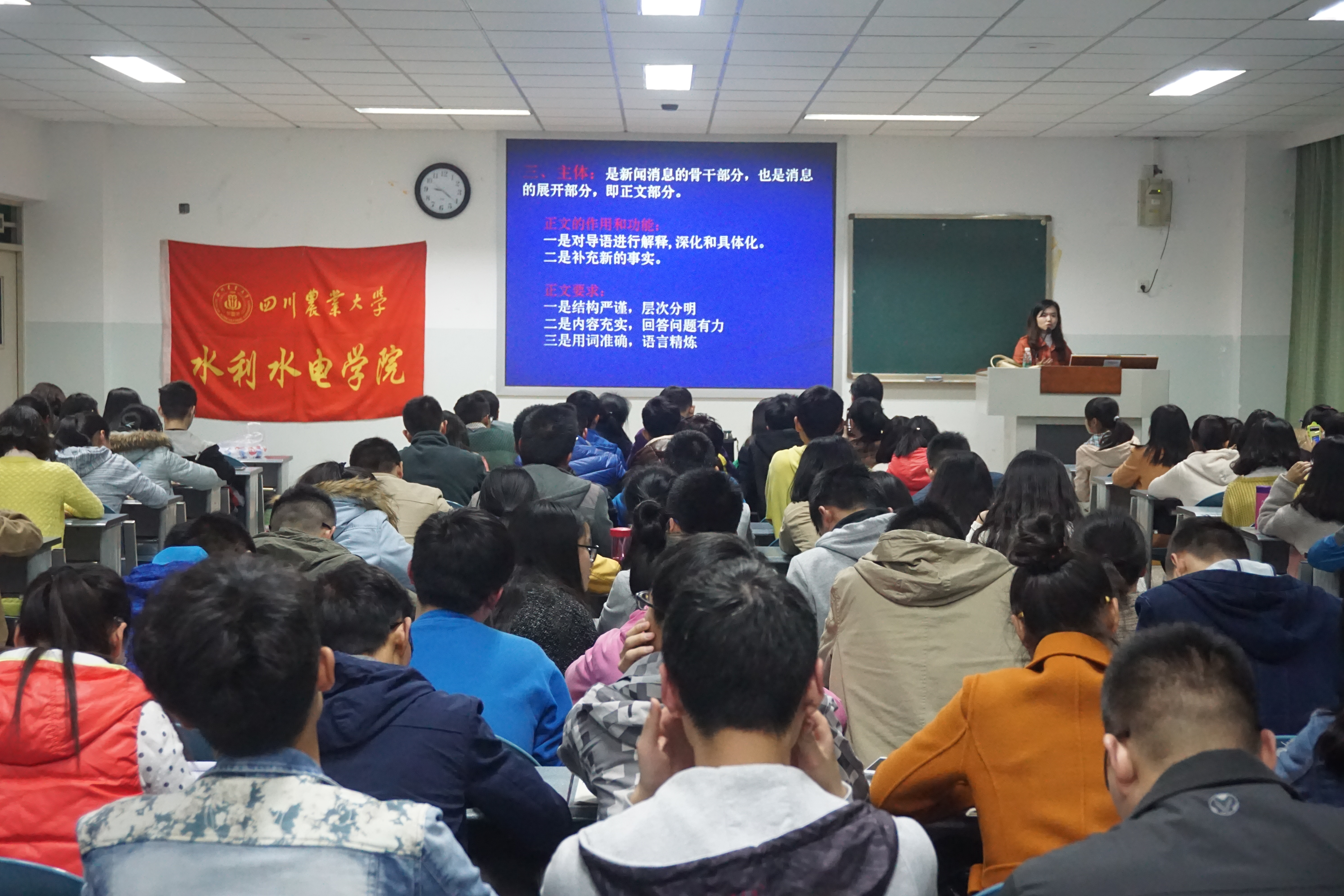 3月18日晚9时许,新葡的京集团8814登录入口学生干部新闻稿写作培训在十教B-408圆满举行。本次培训邀请到学校网络新闻编辑张喆老师作为主讲人,主要针对学院各学生部门干部进行新闻稿写作的技巧讲解。学院党委书记曾小波、各部门学生干部共计100余人参加此次培训。