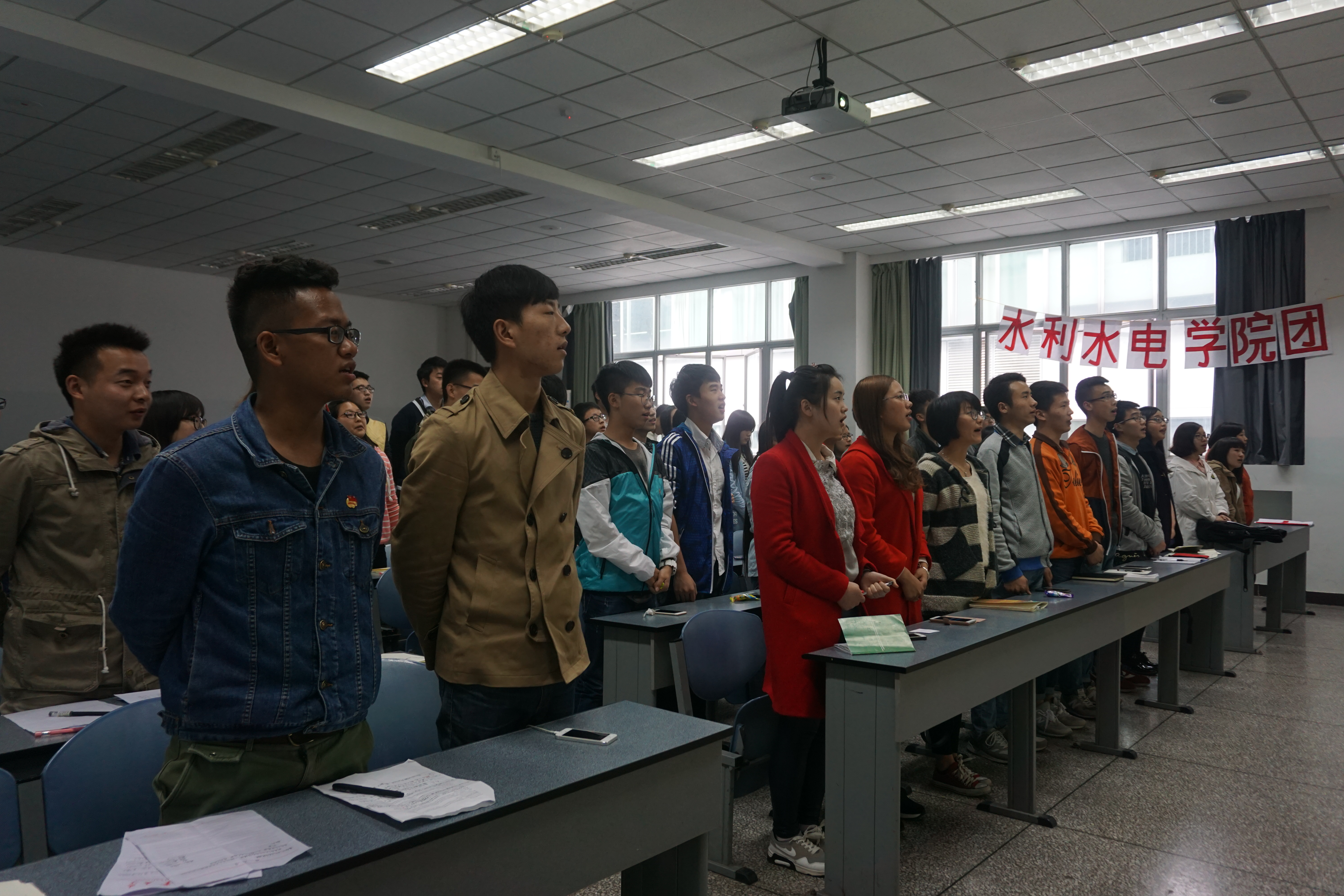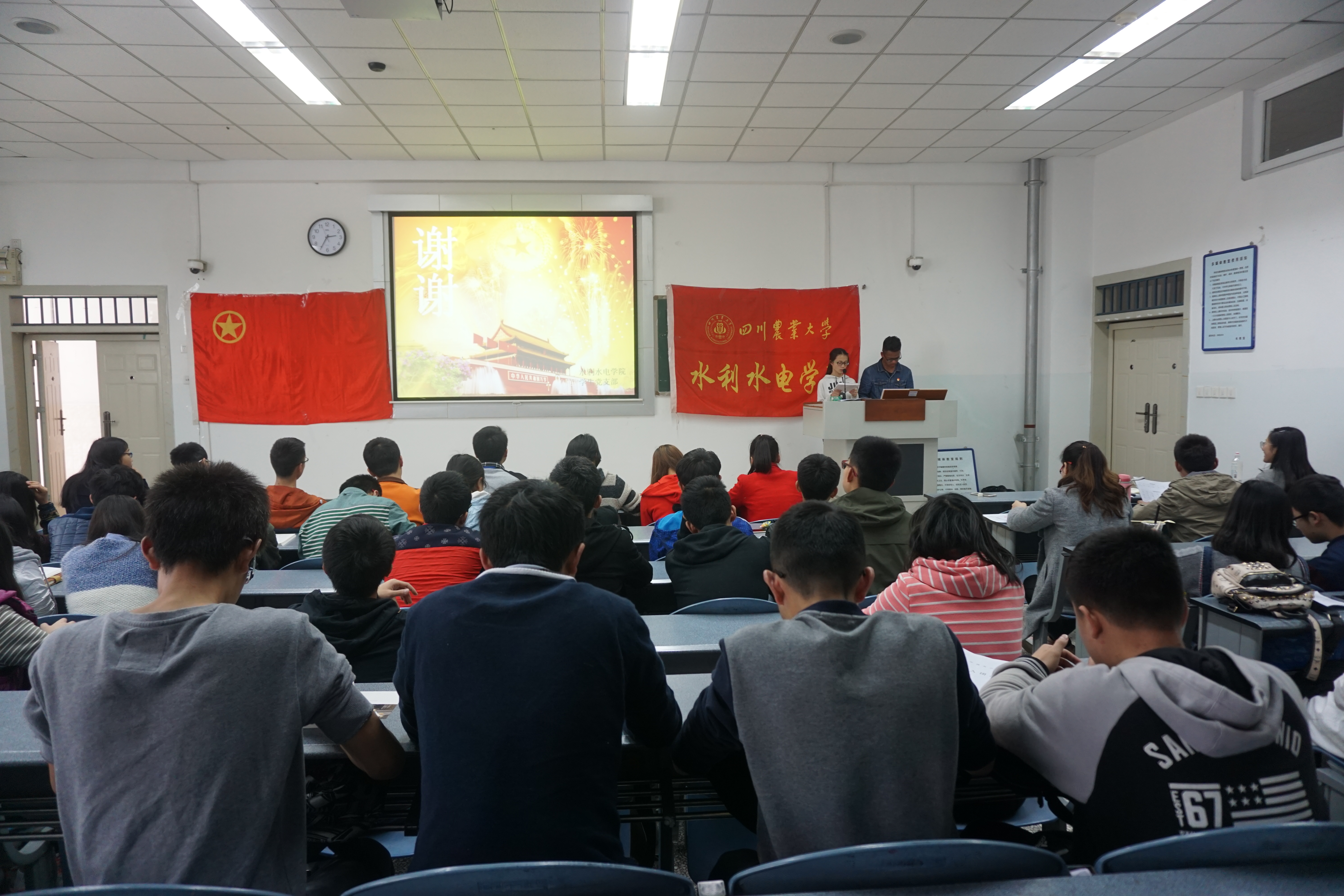 首先,学生水电党支部的杨金凤同学从党团关系、党内基本知识、共产党的性质、党的光辉历程、党员的权利与义务、党的指导思想及党的根本宗旨等方面进行了详细的讲解。其中提到,中国共产主义青年团是党的助手和后备军,在党的坚强领导下,各位团员要自愿服从上级组织的安排,团支部要注重团干部的选拔和培训。党员是中国工人阶级的有共产主义觉悟的先锋战士,必须全心全意为人民服务,永远是劳动人民的普通一员,要自觉为群众服务,不能凌驾于组织和群众之上。同时,对入党的基本流程和党员基本要求进行简单的介绍。随后,学生党支部鲍延生和陈珂两位同学对今年召开的两会进行简单的回顾,主要谈及两会的热点话题,如脱贫攻坚、创新创业、绿色发展、民族团结、两岸关系以及农业现代化等。期间还播放了感动中国人物于敏同志的获奖视频,各组代表纷纷上台分享观看心得。最后,会议进行趣味横生的党史知识有奖竞答赛,各部门轮流做答,大家积极讨论、踊跃回答,现场气氛异常活跃。