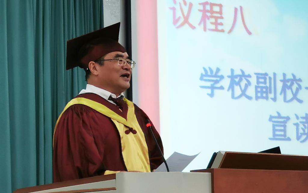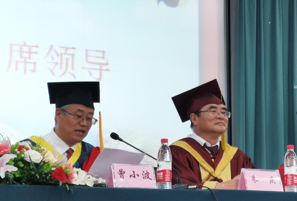 在热烈的掌声中,朱庆宣读了校学位评定委员会关于授予学士学位的决定,卢修元宣读各专业授位学生名单,主席台就座的领导和老师为毕业生举行“拨穗礼”、颁发学位证书。