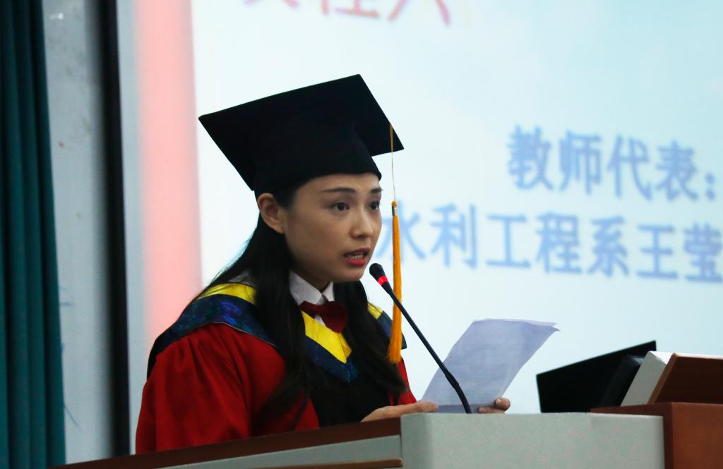 农业水利工程系副教授王莹作为教师代表发言,她不仅向同学提出要感谢一直陪伴守护自己的家人,感谢为自己传道授业解惑的老师,感谢陪自己一起疯一起闹的同窗,还表达了自己对同学们的感谢,感谢同学们给了她活力与自信、快乐与幸福、责任感和使命感。“借用电影《老师•好》里的一句话,‘我不是在最好的时光中遇见了你们,而是遇见了你们才给了我这段最好的时光’。”王莹如是说。优秀毕业生代表黄芯欣同学回顾了大学四年难忘的场景,感谢了老师对自己的培养、关心、与支持,最后她祝母校蓬勃发展,老师幸福安康,同学一路顺风。