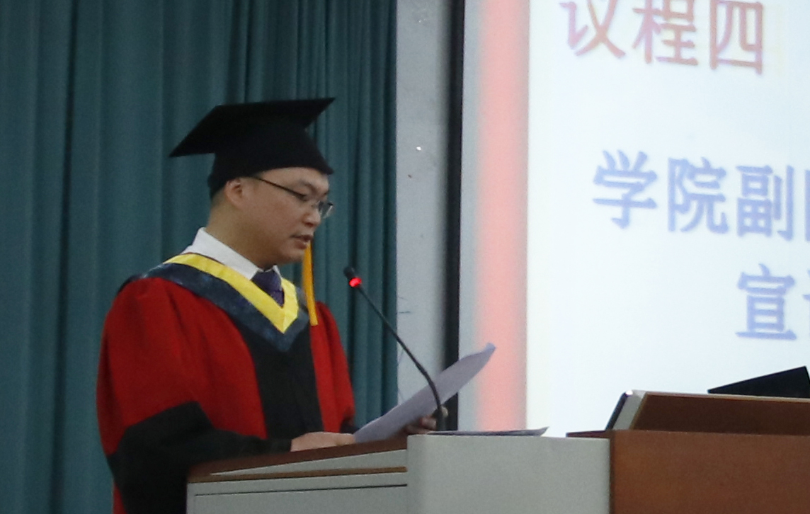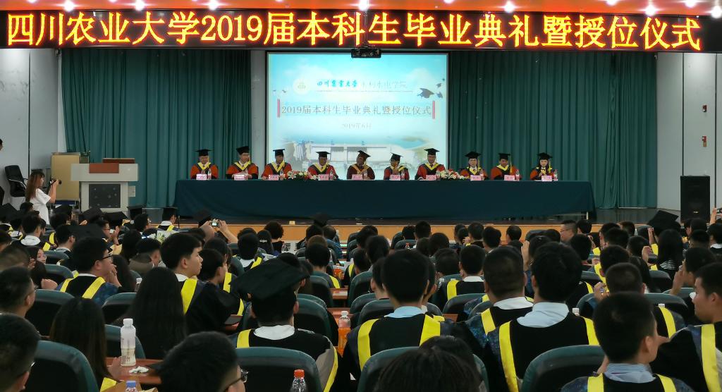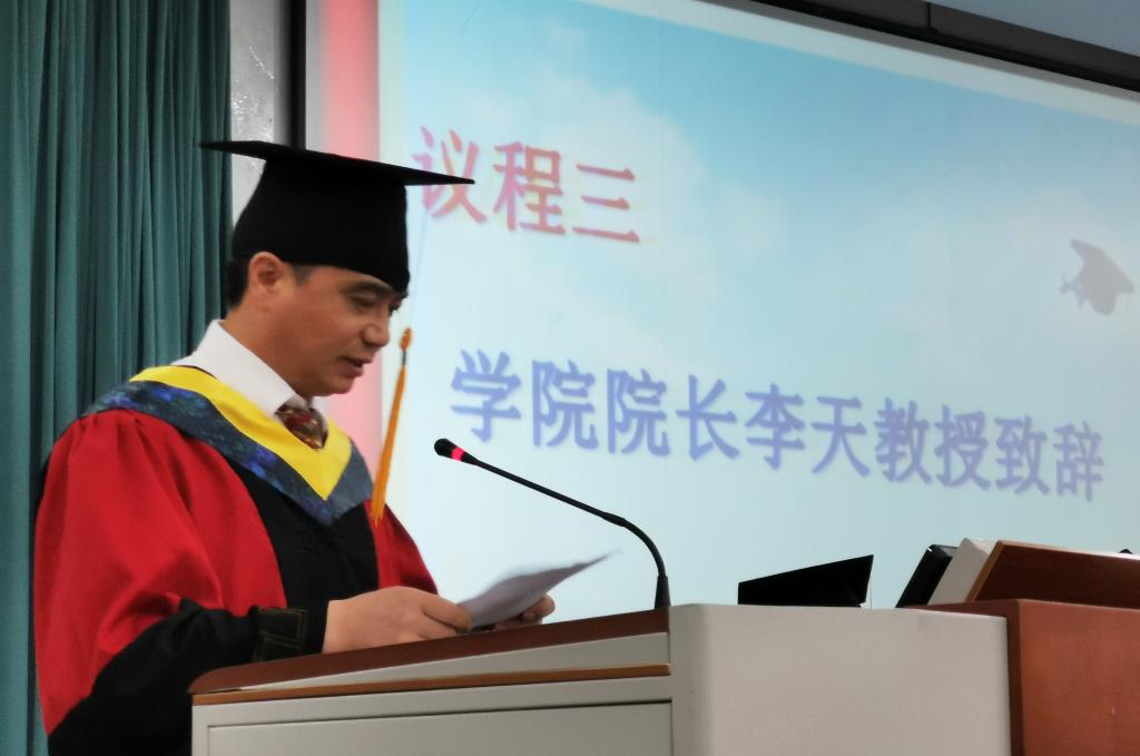 庄严的毕业典礼在雄壮的国歌声中开始,与会人员全体肃立,奏唱国歌。接着,李天代表学院向2019届的同学顺利完成学业表示最热烈的祝贺,他回顾了2019届学生所取得的一系列成就:学院439名学生全部顺利获得学士学位,其中108名同学考取研究生、出国留学,考研留学人数再创新高,此外22名同学获得综合素质A级证书,4人被评为省级优秀毕业生等等。同时,李天借习近平总书记在纪念五四运动100周年大会上对青年人所提出的六点希望,来激励同学们利用所学专业知识解决目前水资源所面临的问题,呼吁同学们积极投身祖国建设的伟业中,他指出今天的大学毕业生处在中华民族发展的最好时期,既拥有广阔的发展空间,也承载着伟大时代使命。他鼓励大家以实干赢得未来,奋力谱写川农学子在民族伟大复兴的中国梦中的光辉篇章!另外,临别之际,他还对毕业生提出了人人自律、崇德向善,尊重他人、心怀感恩等殷切嘱托,勉励同学们做要励志、要自律、要感恩的“三要青年”。