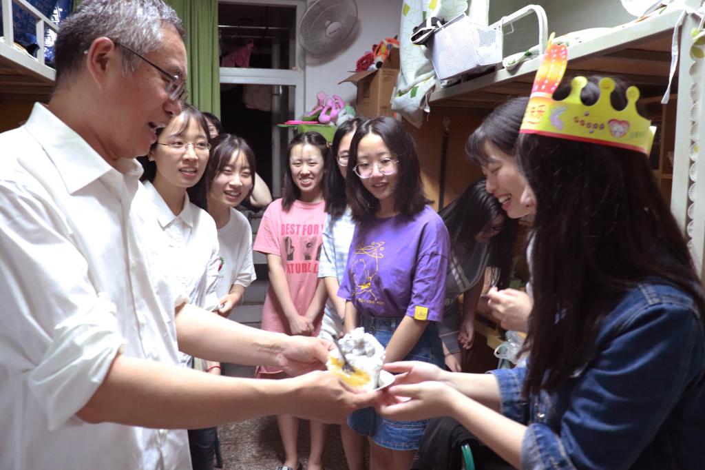 一行人来到十八舍,在看到原任学习部部长时,曾书记亲切地谈起了曾经在学习部用四川话说过的一句话:“学习部学习部,学习不好吃萝卜”,与同学们一起回忆大学四年来经历的美好时光。同时,每探访一个寝室,曾小波都会询问各个同学的就业及考研情况,交谈过程中曾书记向同学们再次强调:人生最重要的两件事就是做人和做事,今后走出了川农大,无论走到哪里,都要时刻记得做人以人品为先,做事以明理为先。众人专心致志地听着书记讲话,格外珍惜此时与老师们围坐一团的时间。随后,当走到三楼寝室时,正好碰上同学们在寝室内庆祝生日,老师们的到访为生日会增添了一份惊喜。曾小波与老师们亲切地为同学唱起了生日快乐歌,祝愿每一个人在多年之后都能成为优秀的川农大校友并重逢在新葡的京集团8814登录入口。同时,曾小波也不忘叮嘱即将走出学校的同学们出门在外一定注意安全,有空常回家看看。