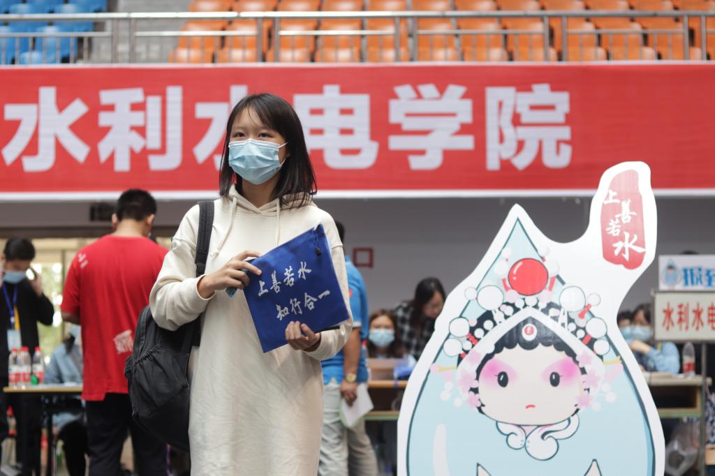在迎新点两旁摆放的水院吉祥物这次也换上了“新装”。带上戏剧头套,这不仅为吉祥物加上了一抹别样的风采,更是寓意着这一届学生承担着继承和发扬传统文化的伟大使命;头饰边的“上善若水”四字代表着水院的院训,水利万物而不争,希望水院学子能在未来做到像水一样能柔能刚,微则无声,巨则汹涌;与人无争却又容纳万物。戴上卡通戏剧头套的小水滴在迎新点格外吸引眼球。在现场工作人员的帮助下,完成报到后的20级小水滴还和一直守护在现场的卡通小水滴一起合影,留下在川农第一个美好的瞬间。