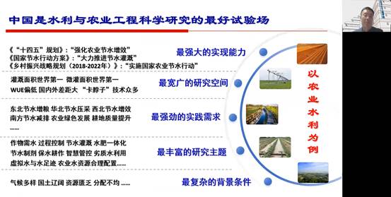 李云开教授以农业水利为例,从《“十四五”规划》、《国家节水行动方案》、《乡村振兴战略规范2018-2022》等强化农业节水增效、大力推进节水灌溉、实施国家农业节水行动、WUE偏低、国内外差距大、“卡脖子”技术多等多方面阐述了中国是水利与农业工程科学研究的最好试验场。其次,结合2021年习近平总书记出席中国科学院第二十次院士大会、中国工程院第十五次院士大会和中国科协第十次全国代表大会重要讲话,以及习近平同志在中国共产党第二十次全国代表大会上的报告,阐述了青年高水平创新人才培养与发展的国家需求。
