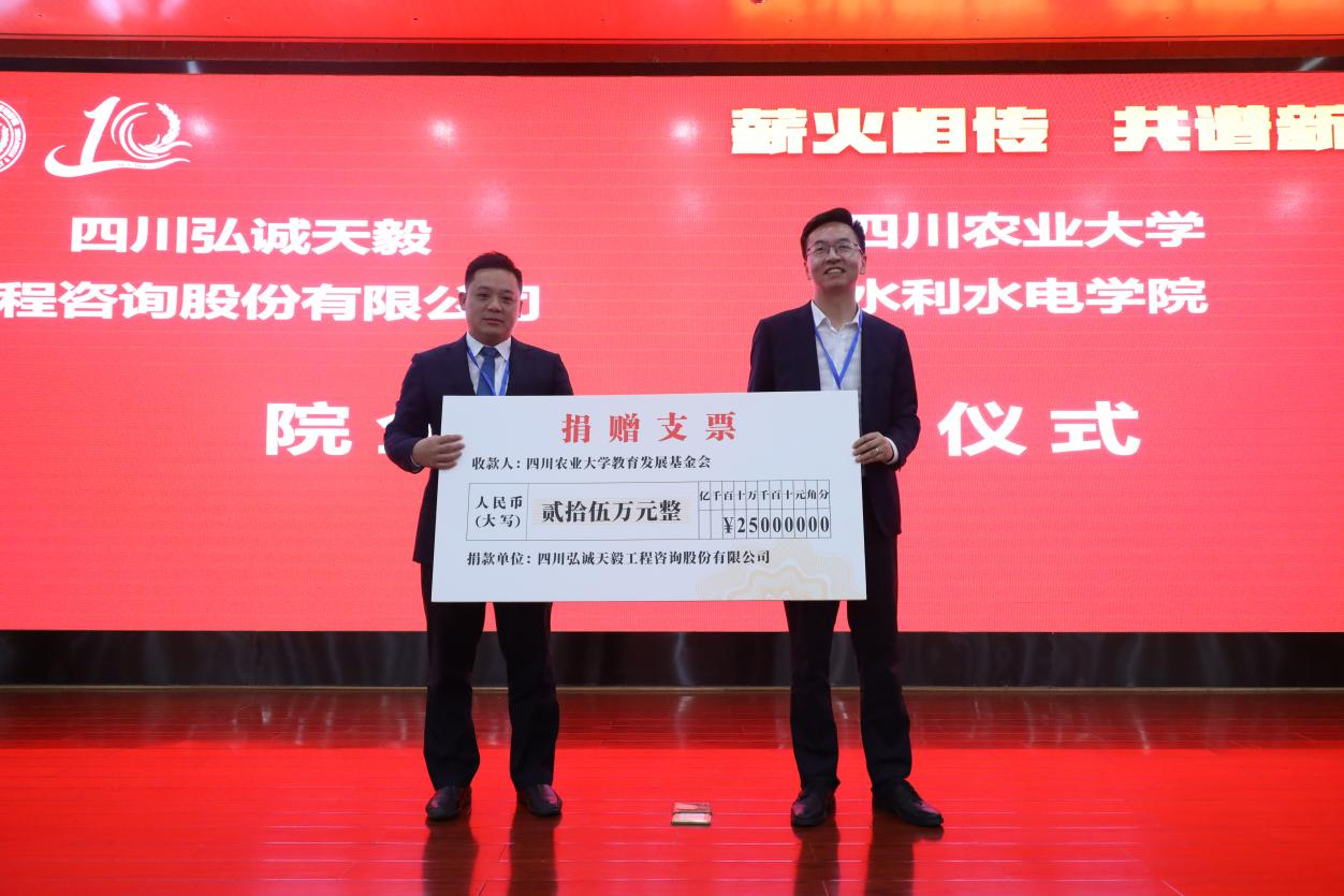 在随后举行的捐赠仪式上,收到四川弘诚天毅工程咨询股份有限公司、成都中土工程设计有限公司、四川嘉泰来农业科技有限公司及校友等共计100万元的捐赠。