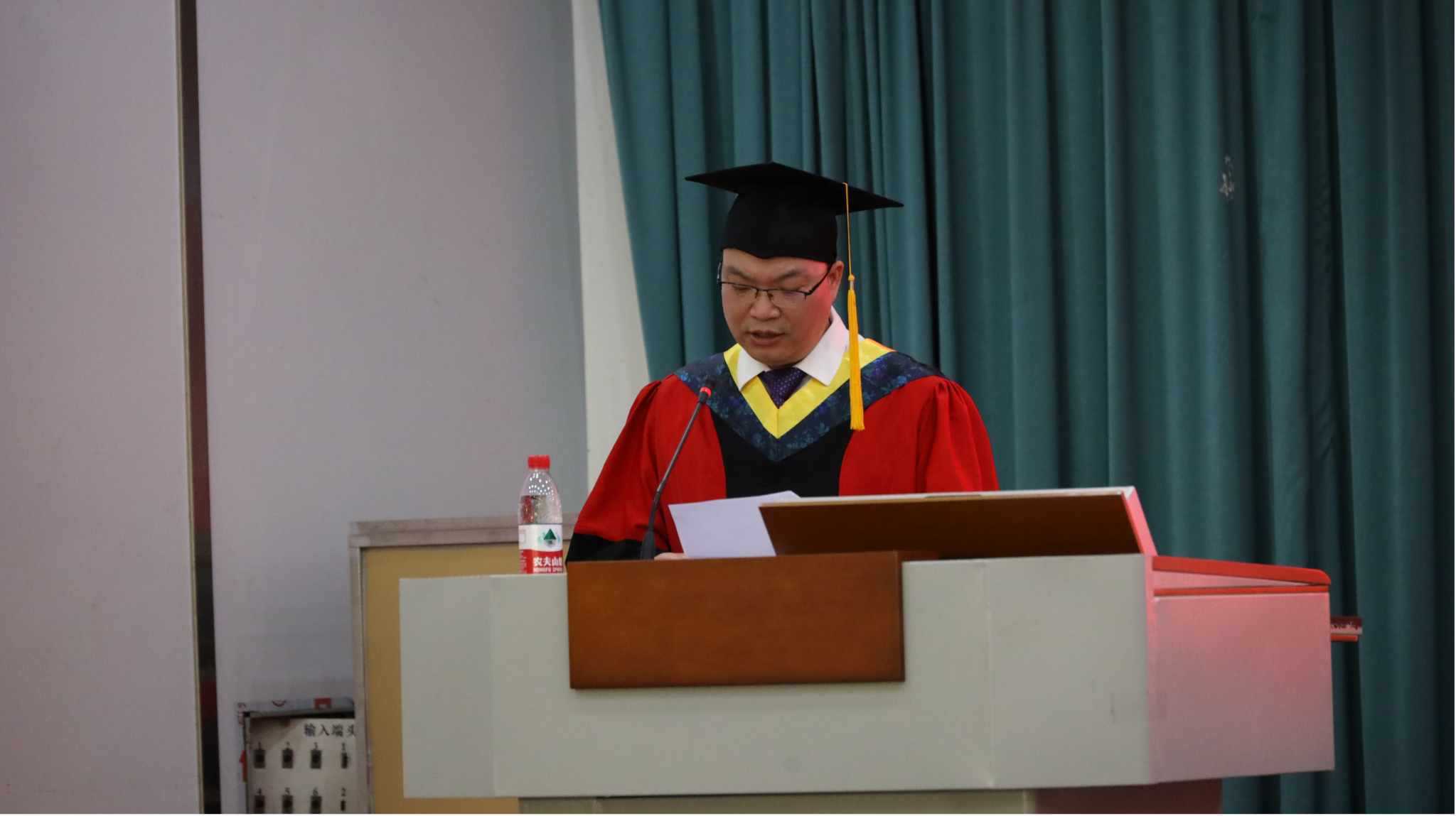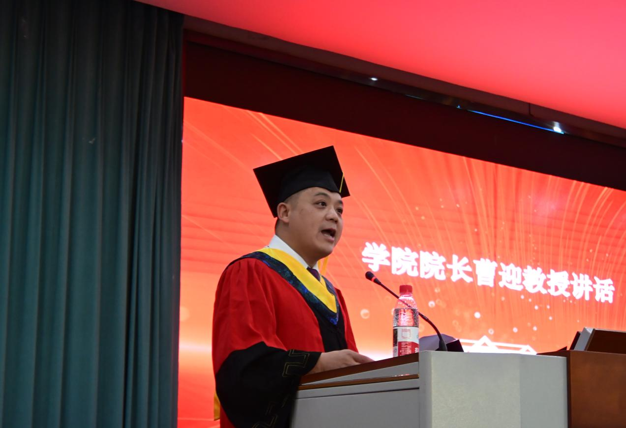 国歌奏毕,学院院长曹迎上台致辞。他首先代表学院全体教职工,向到场的部分毕业生家长等来宾表示热烈欢迎,向悉心指导毕业生的老师们表达衷心感谢,同时向421名2025届毕业生致以热烈祝贺。