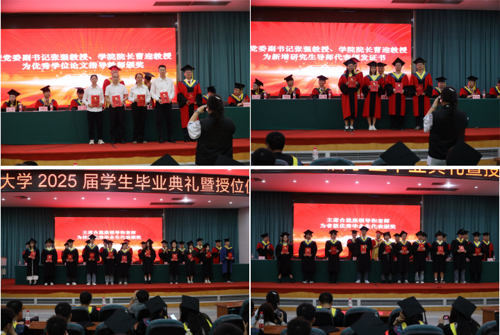 学校党委副书记张强教授宣读校学位评定委员会关于授予硕士学位、学士学位的决议。学院副院长卢修元副教授依次宣读硕士学位、学士学位获得者名单。硕士生和本科生们怀着激动的心情依次上台,主席台领导和老师们为他们逐一授位并合影留念。这些定格的瞬间,不仅是对毕业生学业成就的肯定,更承载着他们奔赴未来的勇气与信心。