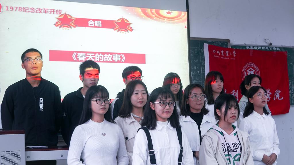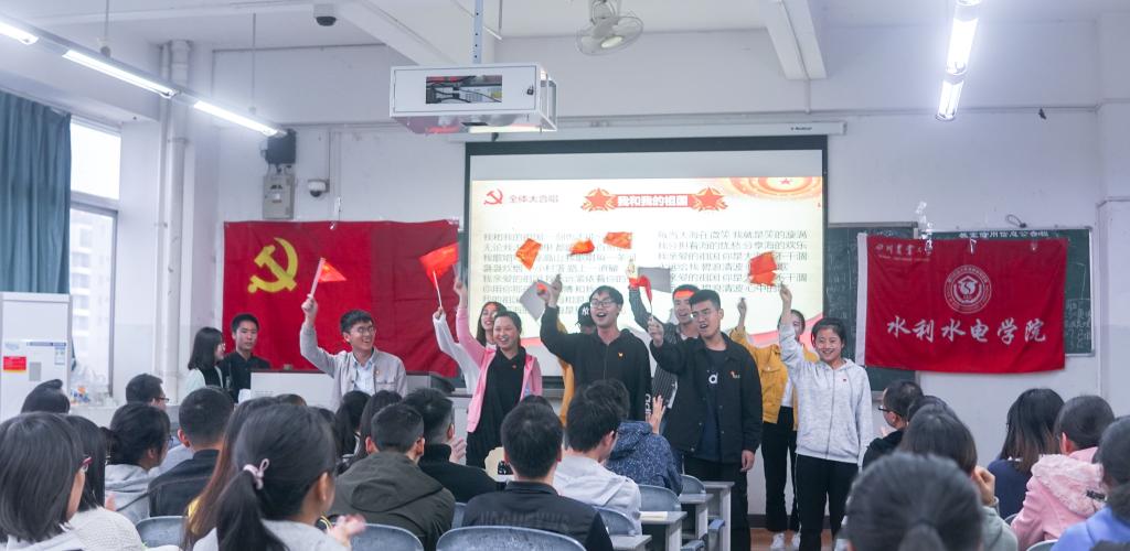 活动伊始,全员起立,奏唱国际歌。随后在主持人的带领下,在场人员回顾了改革开放的历史进程,同时建环党支部及入党积极分子也分别带来诗朗诵《我们最伟大的节日》和歌曲合唱《春天的故事》。为调动同学们的积极性,此次活动增加有奖竞答环节,各组人员积极回答,现场气氛高涨。恰逢祖国七十华诞,全体成员也一起回看70周年大阅兵短视频,同时水利专业党支部也高声合唱《我和我的祖国》,激昂的歌声中无不充满着对于祖国的浓浓爱意。