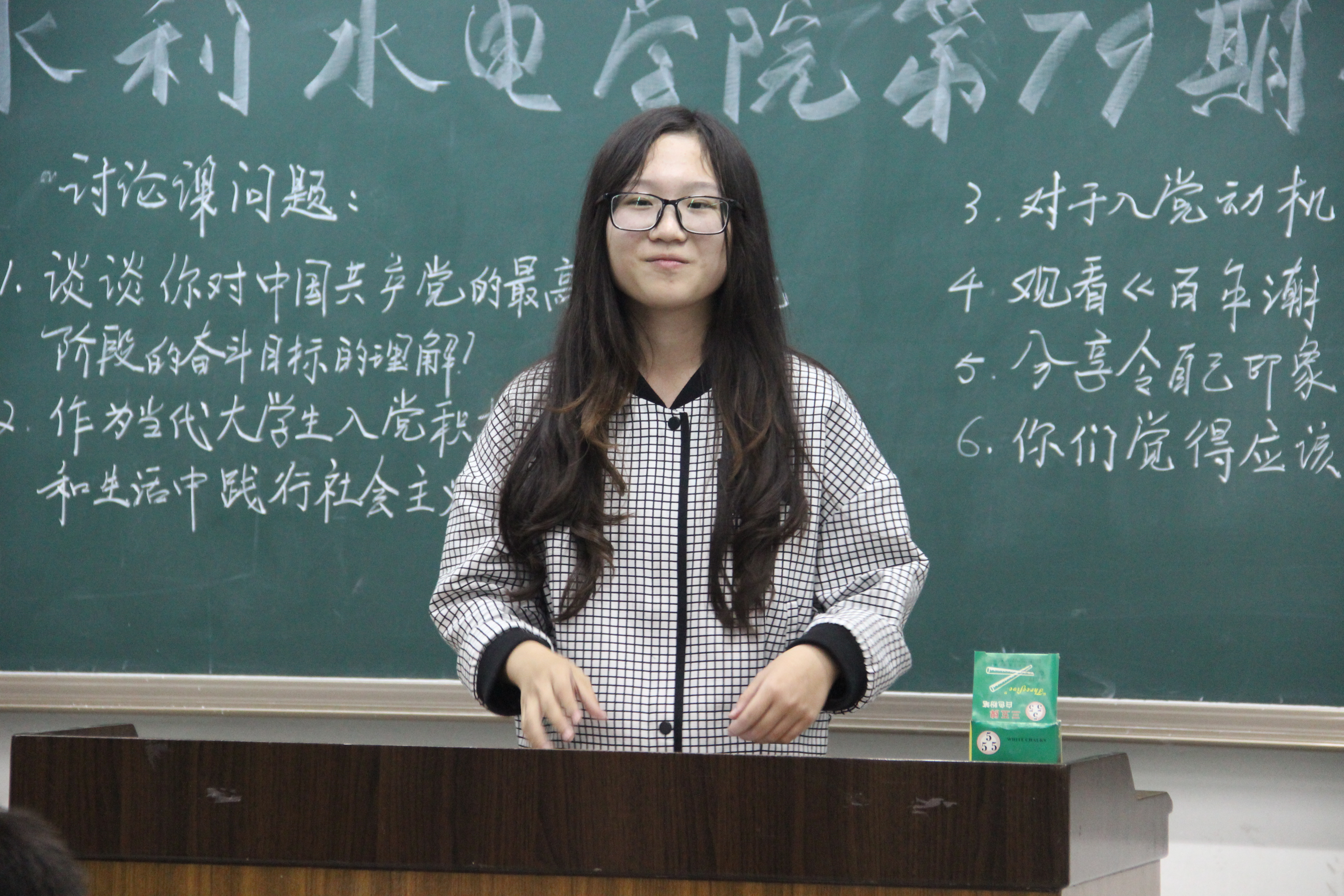 活动中,党校学员按照“对中国共产党最高理想和现阶段的奋斗目标的理解”、“大学生如何在学习和生活中践行社会主义核心价值观”、“如何看待入党动机不良现象”、“观看《百年潮 中国梦》后的感想”、“分享令自己印象最为深刻的党员的故事”、“怎样做才算是合格的学生党员”等六个问题进行分组讨论,各小组派代表结合思想、生活、学习、工作四方面的实际情况就以上问题分享小组观点,并对前一组的发言内容进行点评和补充。优秀学生党员代表、优秀学生标兵获得者苗舒婷发言时强调,作为学生党员,一定要端正入党动机,同时讲述了自己对“为人民服务”宗旨的感悟和所获。